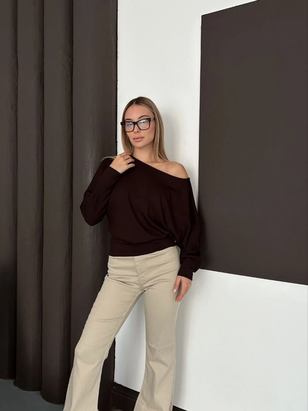 Düşük Omuz Modal Bluz - Kahverengi