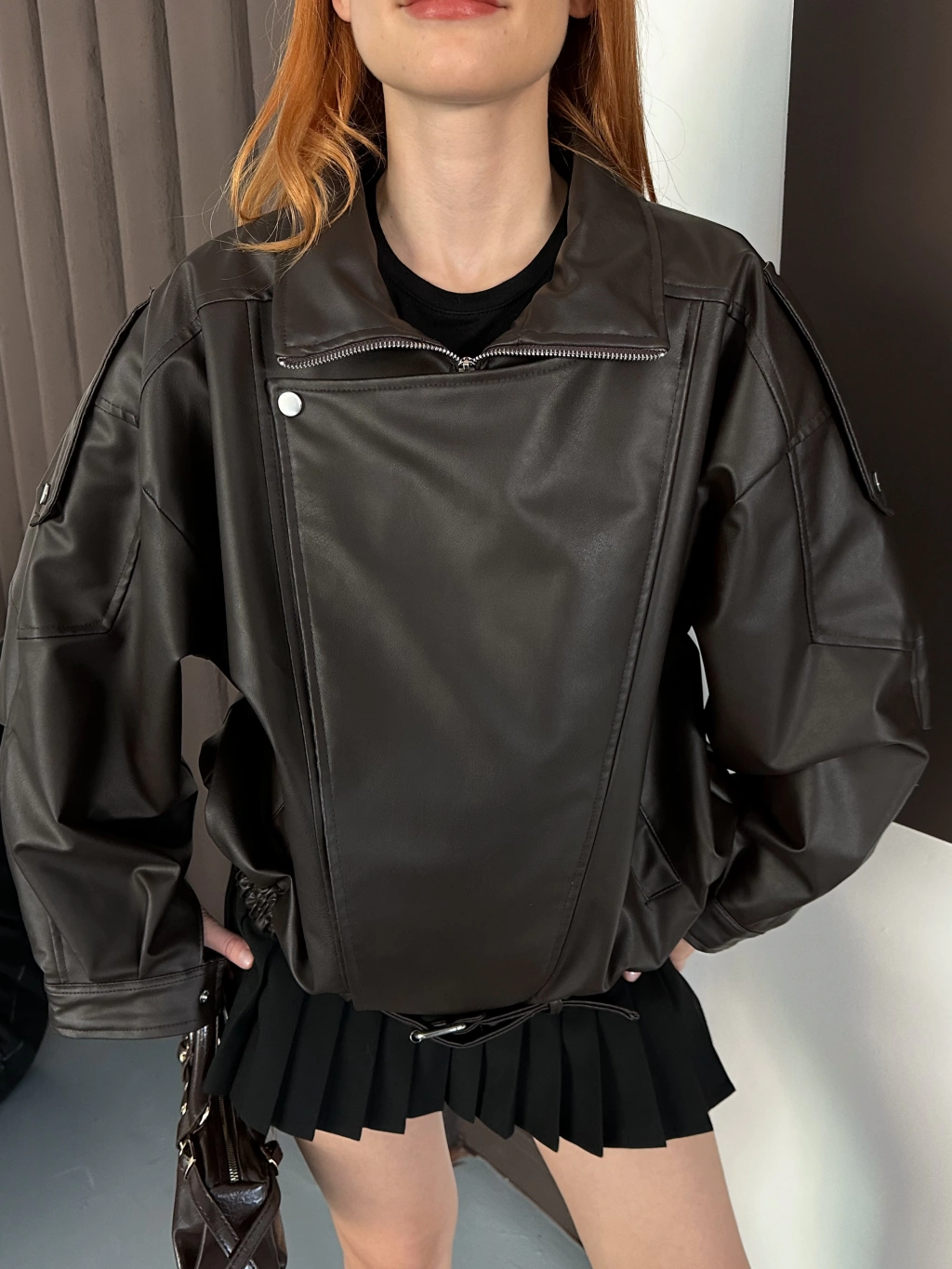 Oversize Kemer Detay Deri Ceket