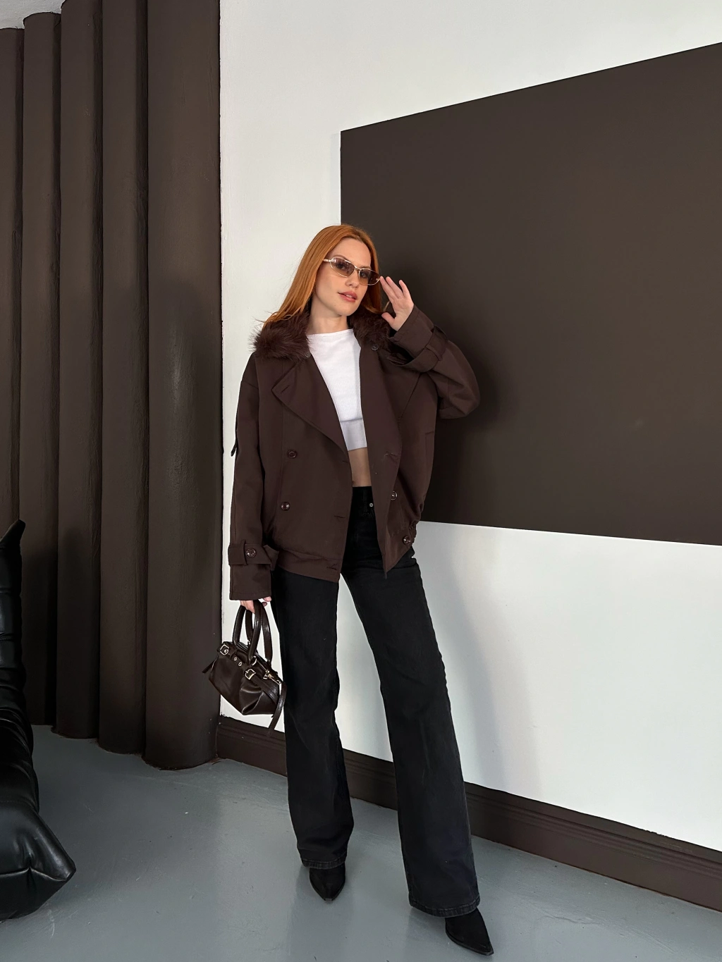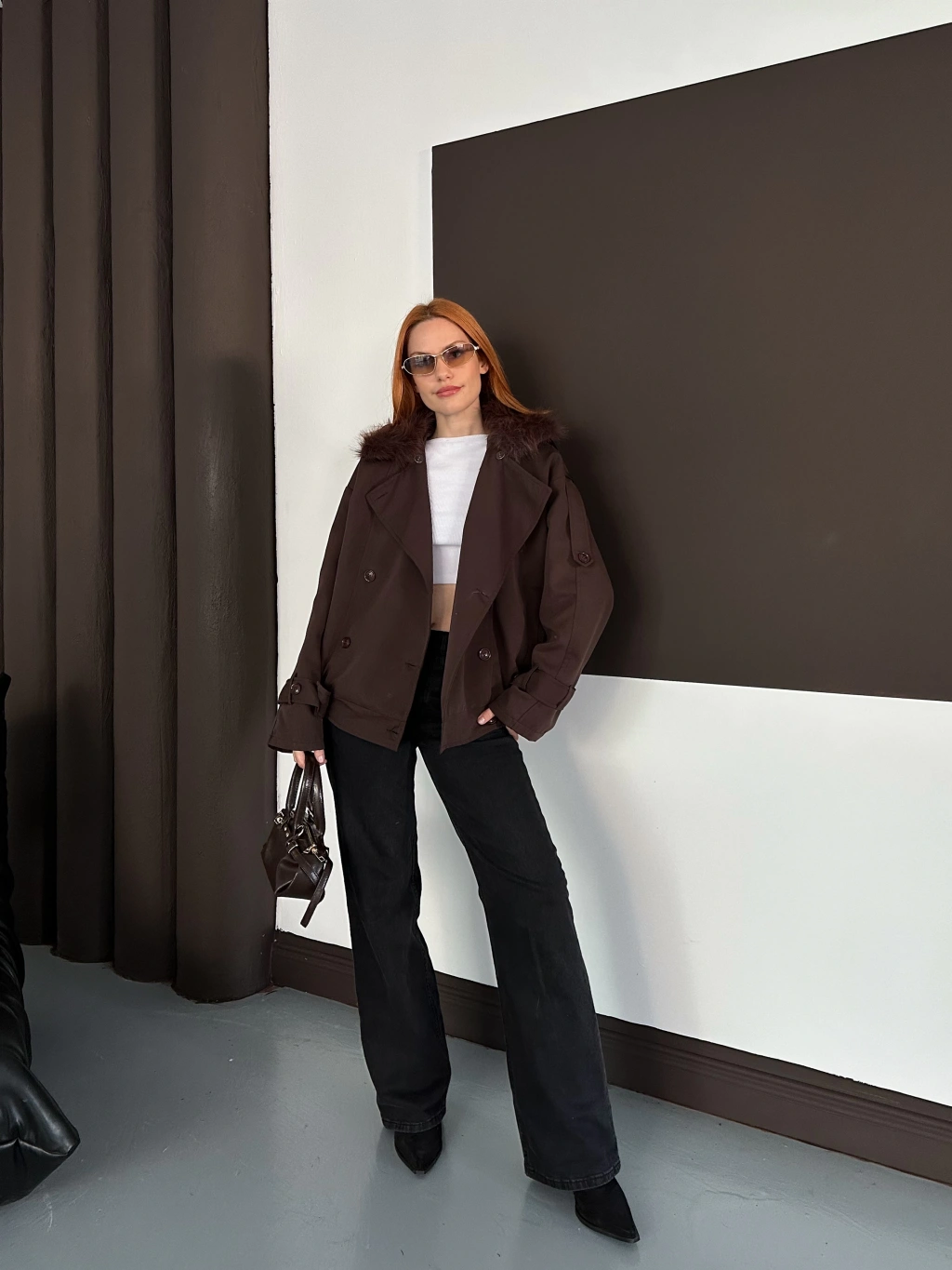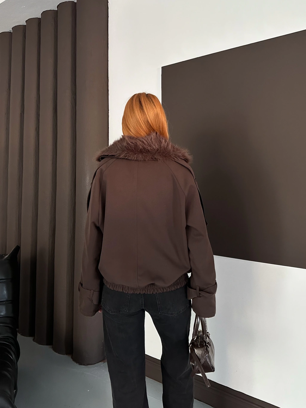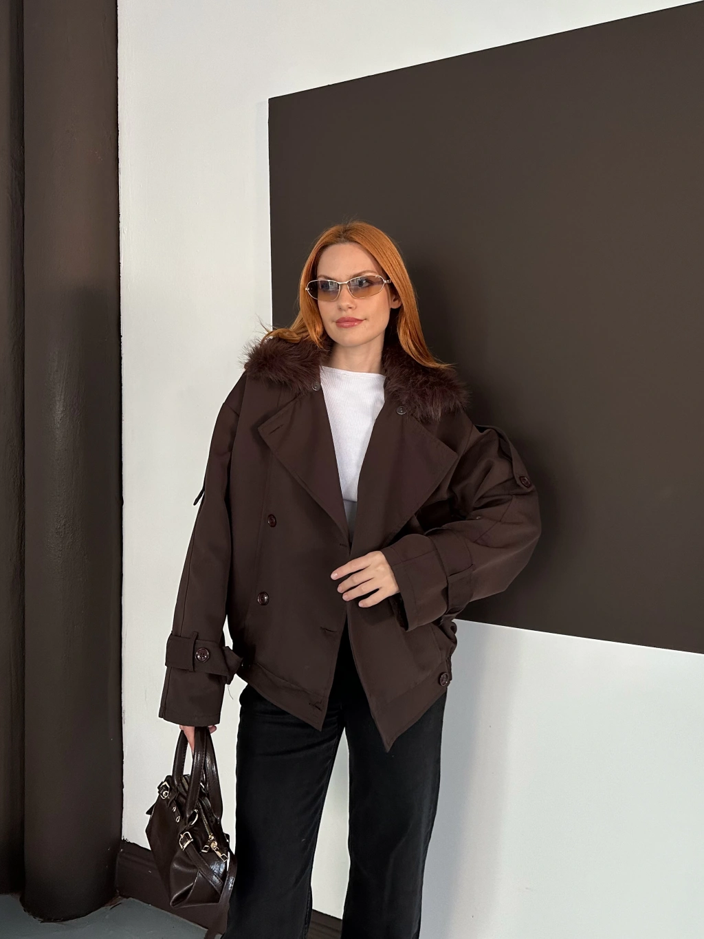 Yaka Peluş Trençkot - Kahverengi